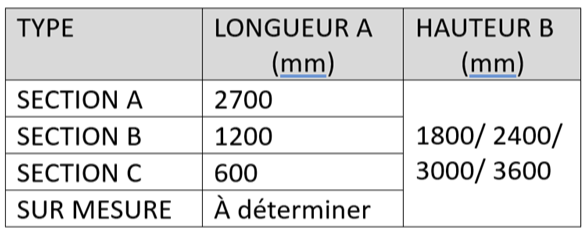En standard, une porte à un ou deux battants peut compléter la section A. Dimensions de la porte :